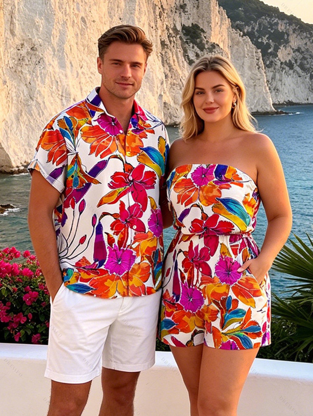 Hawaiian Vacation Couple Outfit Colorful Watercolor Floral Print Pocket Off the Shoulder Romper and Shirt Set