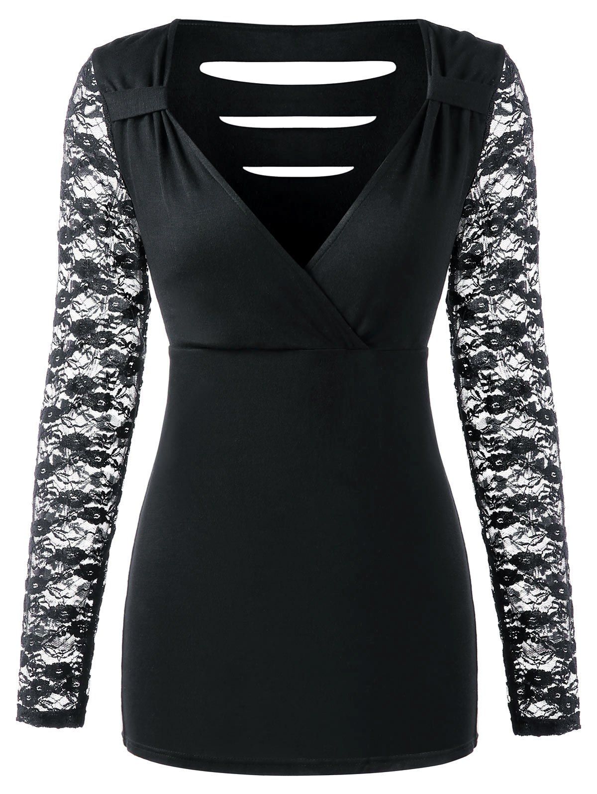 Lace Long Sleeve Faux Wrap T-shirt - BLACK XL