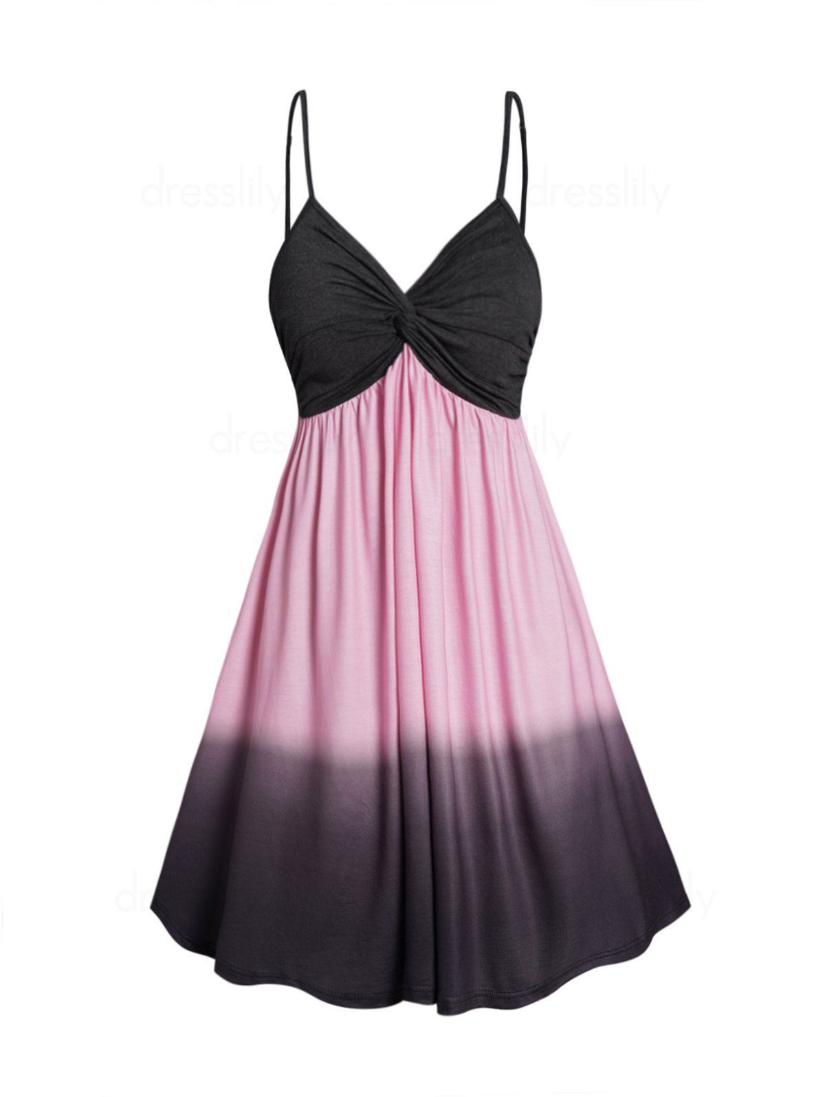 Ombre Dress Ruched Empire Waist Twisted Spaghetti Strap A Line Mini Dress - BLACK M