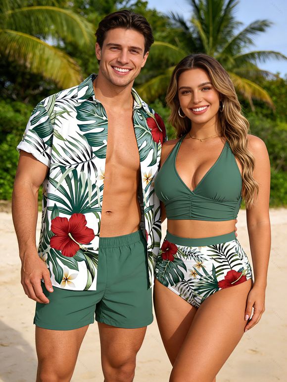 Vacation Couple Outfit Palm Leaf Hibiscus Print Crossover Ruched Swimsuit and Shirt Set - PLANT GREEN S | US 4